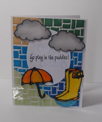 The Friday Mash up this week is to make a card with an umbrella on it. I started out embossing my umbrella and boots. Then colored them in. Pressed them onto a Versa Mark pad and clear embossed. The background is a puzzle like technique using an embossing folder.